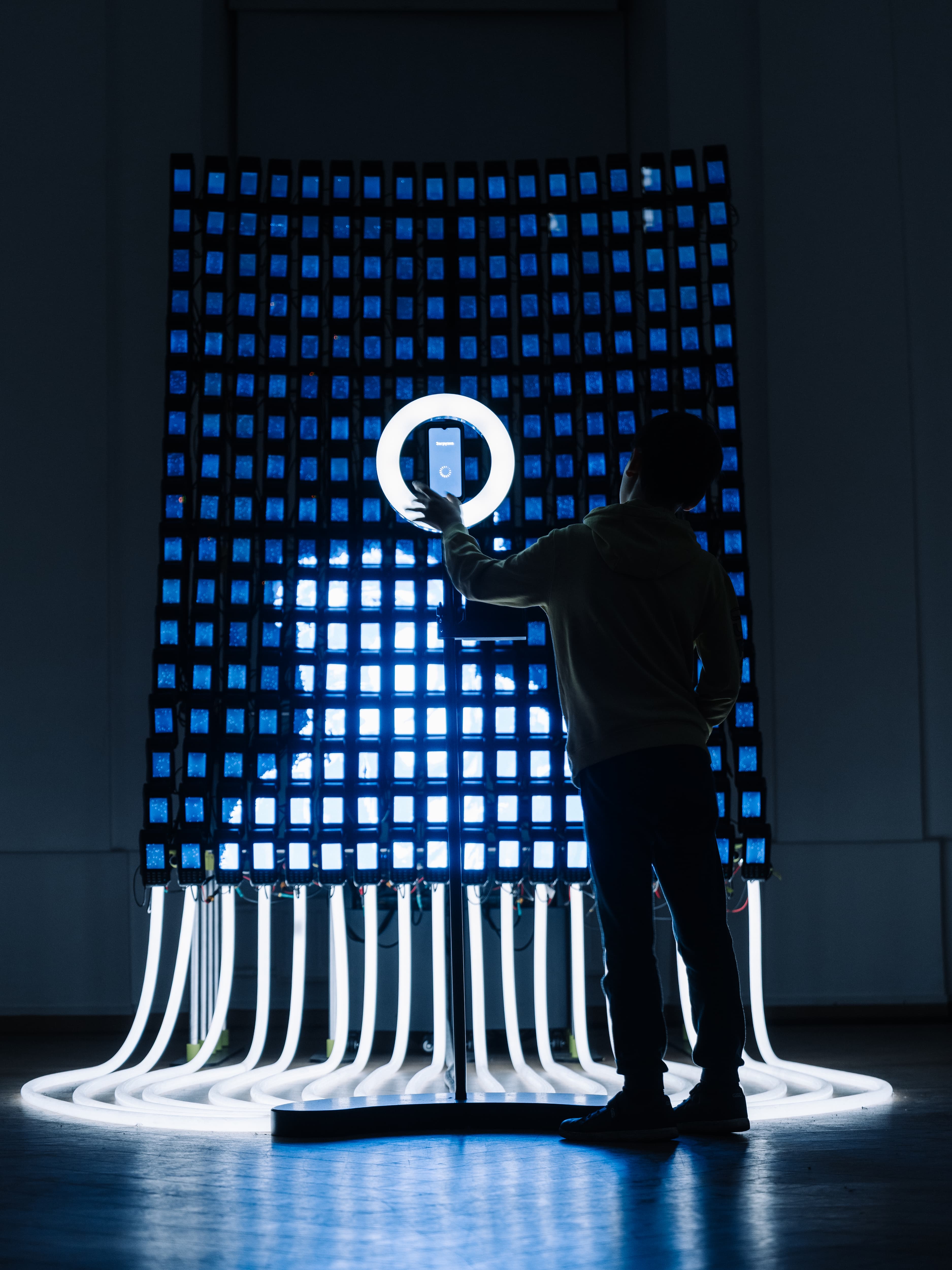 306 devices became a single dynamic canvas. Signals, transactions, and data flows were translated into light and motion, creating a living architecture. Interaction through face recognition connected identity with system response, turning invisible processes into visible behavior.